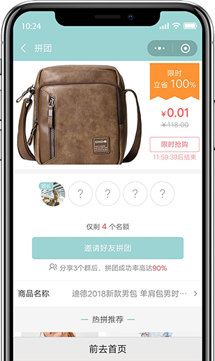 微拼團是商品營銷和售賣的一種方式,通過社交關系鏈分享傳播,可自由設置開團人數,開團價格。用戶在分享時,小程序上實時顯示當前的拼團信息,比如已經有多少人參與,價格是多少等。